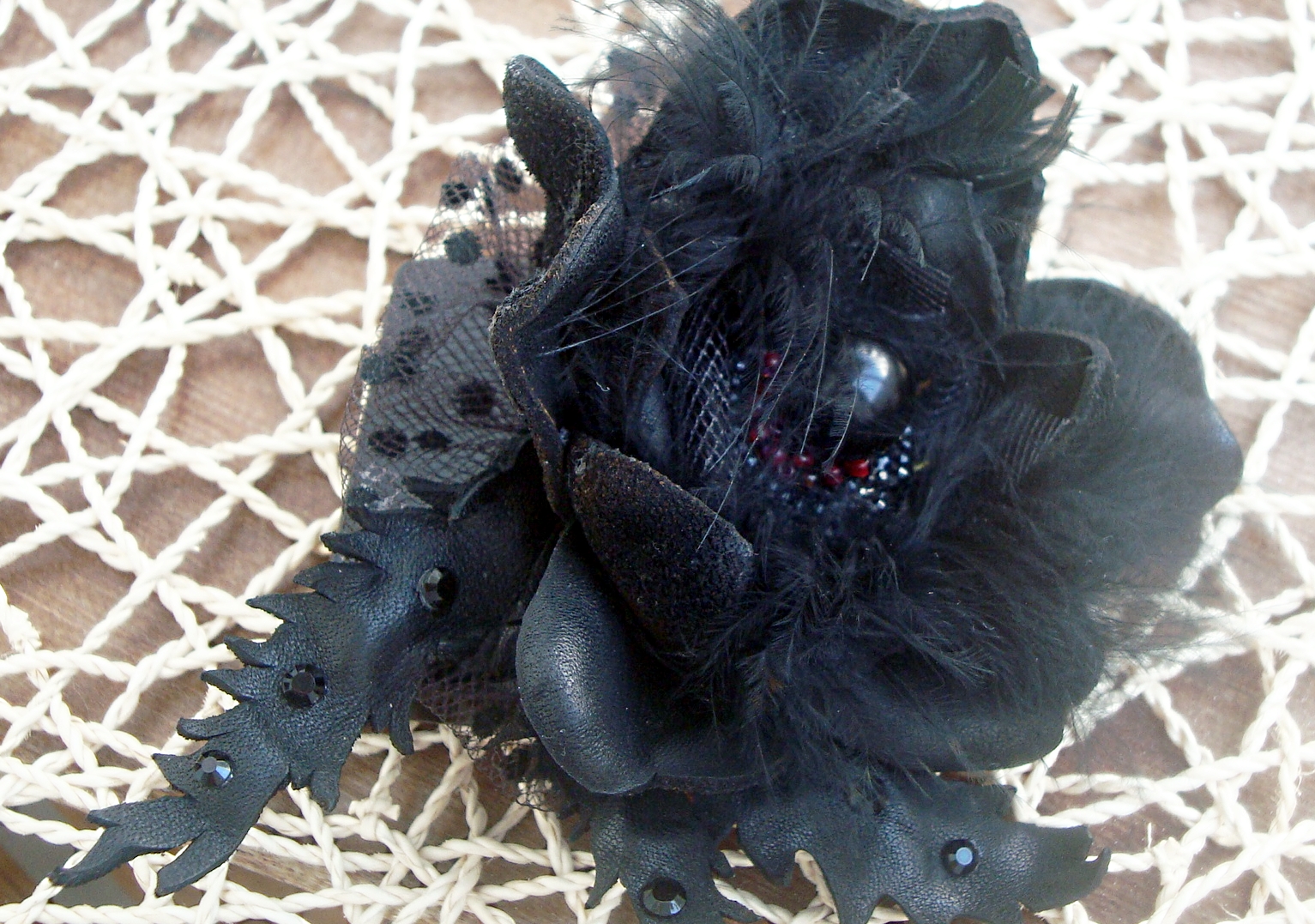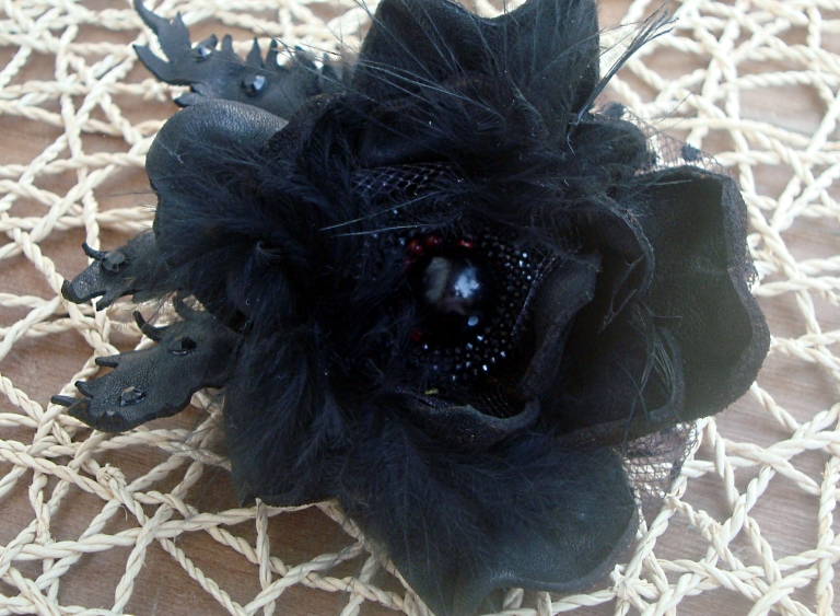 Добавила немного перьев, большую бусину для серединки и бисер. Чуть фатина, дабы придать немного нежности кожаному цветку).