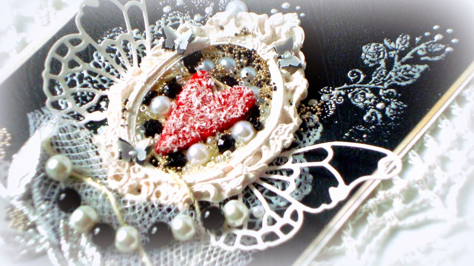 На темном фоне распускаются бутоны (эмбоссинг белой пудрой) сердце- чипборд, опкрашенный акрилом, а потом для блеска..лаком для ногтей!!! (да, вот такой бзик у меня возник...попробовать) Внизу, нить из бусинок..черные..белые..как наша жизнь...полоса белая, полоса темная..полоса белая...